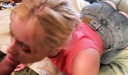 Молодая блондинка в джинсах кончает во время съемки русского порно