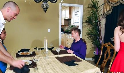 Две симпатичные девахи всегда считались лучшими шлюхами на районе ровно до тех пор пока не вышли замуж. Благо после этого они слегка остепенились, но натуру не исправишь и вот сегодня девушки планируют соблазнить мужей на групповой секс и заодно поменяться ими друг с другом. Для этого две парочки устраивают общий завтрак на котором соблазняют мужиков на свингерскую групповуху. Ну да каждый приходит к свингу своей дорогой, а вот эти товарищи через своих жен.