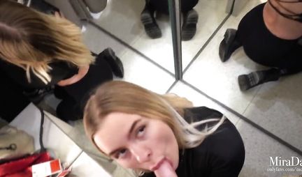 Каждый развлекается в силу своих умений, предпочтений и финансовых возможностей. Так эта симпатичная русская парочка балдеет от прогулок по торговому центру во время которых она примеряет обновки, фоткается на телефон и занимается сексом в кабинке для переодевания. Оказывается в подобных местах можно не только делать покупки, но и минет...